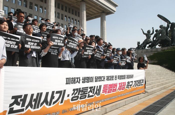 16일 국회 본청 앞에서 전세사기깡통전세피해자전국대책위원회와 전세사기깡통전문제해결을위한시민사회대책위원회 등이 전세사기·깡통전세 특별법 제정 촉구 기자회견을 하고 있다.ⓒ데일리안DB