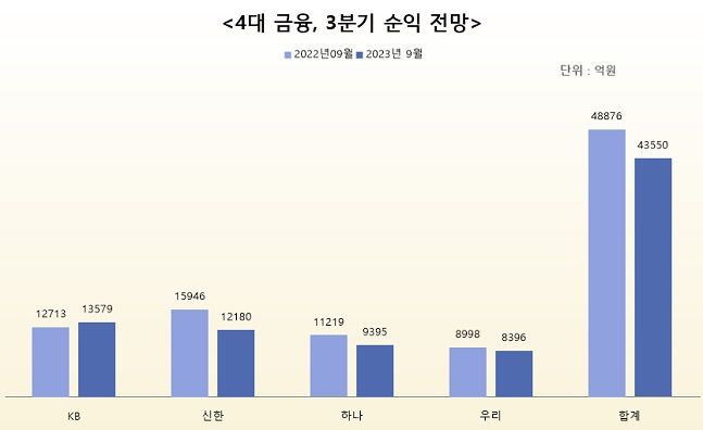 11일 금융정보업체 에프앤가이드에 따르면 KB·신한·하나·우리금융 등 4대 금융그룹의 3분기 당기순이익(지배주주 순이익 기준) 전망치는 4조3550억원으로 역대 최대를 기록했던 전년 동기 대비 10.90% 감소할 것으로 예측됐다.