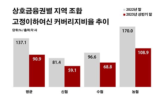 이는 상호금융 조합들이 여신 건전성 악화에 대비해 준비해 둔 충당금보다 부실채권이 더 많아졌다는 의미로, 향후 잠재적인 부실에 대비할 수 있는 여력이 축소됐다는 뜻이다. NPL 커버리지비율은 금융사가 보유한 부실채권을 가리키는 고정이하여신 잔액과 비교해 충당금을 얼마나 적립하고 있는지 보여주는 지표다.