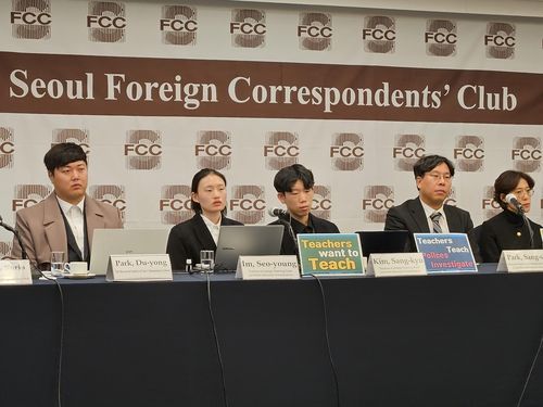 서이초 유족 측과 교사집회 주최 측이 15일 서울 중구 프레스센터에서 외신기자클럽과 함께 기자회견을 개최하고 있다. ⓒ연합뉴스