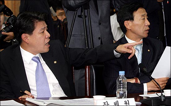 한나라당 장제원 의원이 14일 경기도 수원시 경기도청에서 열린 행안위 국정감사에서 민주당 강기정 의원이 김문수 도지사의 소방헬기 사용에 대해 질의하며 반말을 사용했다며 거세게 항의하