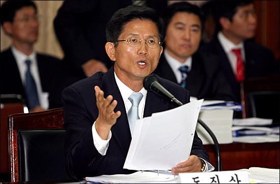 김문수 경기도지사가 14일 경기도 수원시 경기도청에서 열린 행안위 국정감사에서 민주당 강기정 의원의 소방헬기 사용에 관한 질의에 헬기사용이 적절했다고 답변하고 있다.
