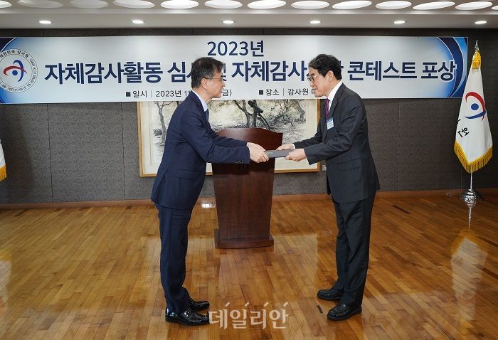 이삼규 한국수자원공사 상임감사위원(오른쪽)이 최재해 감사원장으로부터 2023년 자체감사 콘테스트 사전컨설팅 최우수상을 받고 있다. ⓒ한국수자원공사