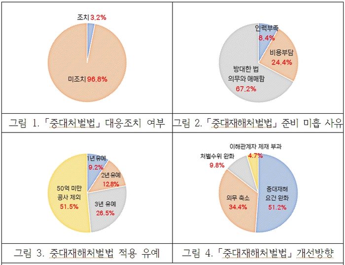대한건설정책연구원에 따르면 전문건설사 781곳 중 중대재해처벌법 대응을 위해 안전관리체계 구축, 인력·예산 편성 등 조치를 취한 기업은 3.6%에 그친다. 그 외 96.8%는 ‘별다른 조치 없이 종전 상태를 유지’하는 것으로 조사됐다.
