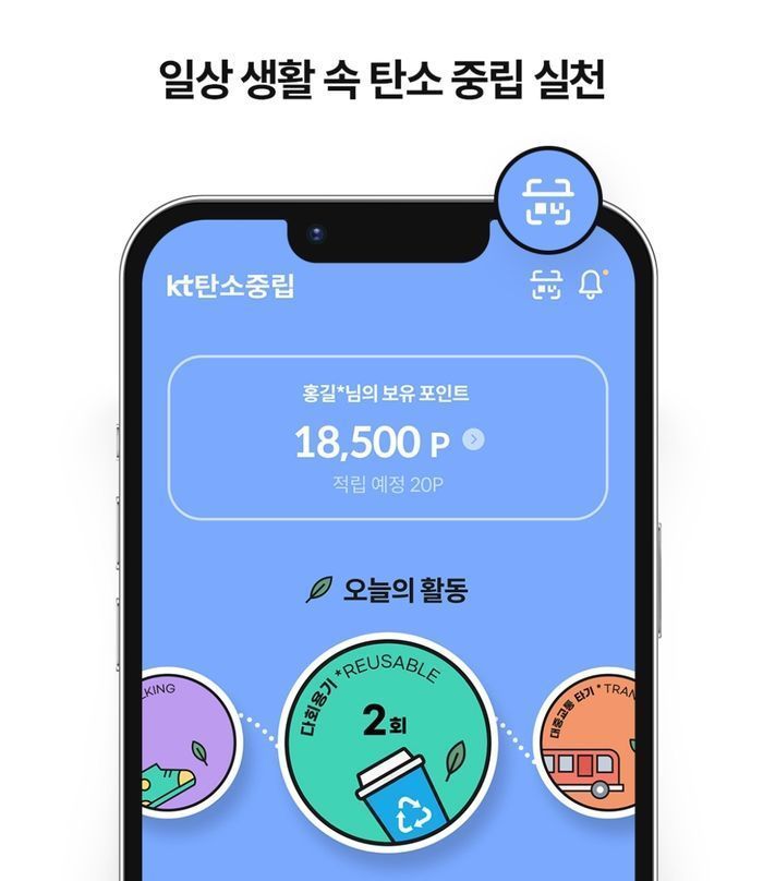 KT는 다양한 탄소중립 활동을 데이터화해 이용자의 탄소중립 기여도를 확인할 수 있게 만들었다. 현재 제공 서비스는 '걷기'와 '다회용기 사용'이다. 하루 동안의 걸음 수와 다회용 컵 사용으로 얻은 점수를 포인트화해 친환경 제품을 구매하거나 관련 서비스를 이용할 수 있다. 사용자들은 포인트를 통해 자신의 누적 탄소 절감량을 확인할 수도 있다. 현재는 단순 측정만 가능한 단계이지만, 추후 포인트 활용처를 늘려 서비스 혜택을 늘려갈 방침이다.