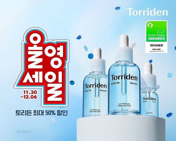 클린뷰티 브랜드 토리든(Torriden)의 '다이브인 저분자 히알루론산 세럼(이하 다이브인 세럼)'이 '2023 올리브영 어워즈'를 수상하며 3년 연속 수상의 기록을 달성했다.