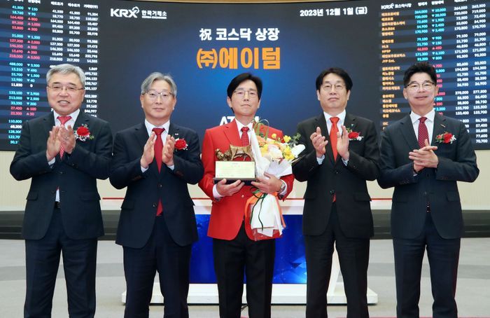 홍순욱 한국거래소 코스닥시장본부장(왼쪽에서 두 번째)이 1일 오전 서울 여의도 한국거래소 서울사옥 홍보관에서 평판형 트랜스(변압기) 생산기업 에이텀의 코스닥시장 상장기념식에서 한택수 에이텀 대표이사(가운데)에게 상장기념패를 전달한 뒤 참석자들과 기념촬영을 하고 있다. 왼쪽부터 채남기 한국IR협의회 회장, 홍 본부장, 한 대표, 박병기 하나증권 기업금융본부장, 김준만 코스닥협회 상무.