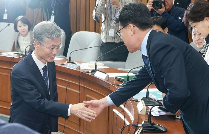 조희대 대법원장 후보자가 5일 국회에서 열린 인사청문회에서 더불어민주당 진성준 의원과 악수하고 있다.ⓒ연합뉴스