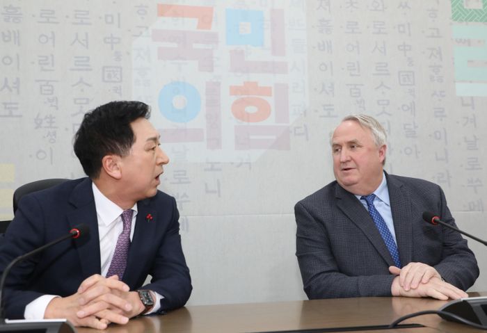 김기현 국민의힘 대표와 인요한 혁신위원장이 6일 서울 여의도 국회 국민의힘 당대표실에서 만나 대화를 하고 있다. ⓒ뉴시스