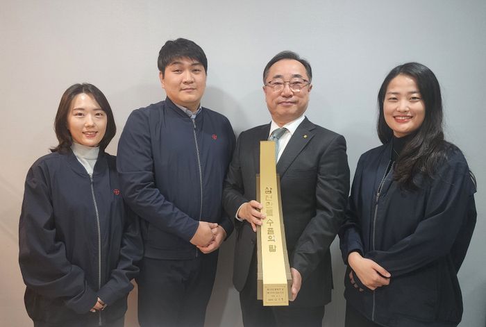 김병제 KBI알로이 대표이사(왼쪽 세번째)와 수출 업무 담당 직원들이 제60회 무역의 날에서 수상한 ‘삼천만불 수출의 탑’을 들고 기념촬영을 하고 있다. ⓒKBI그룹