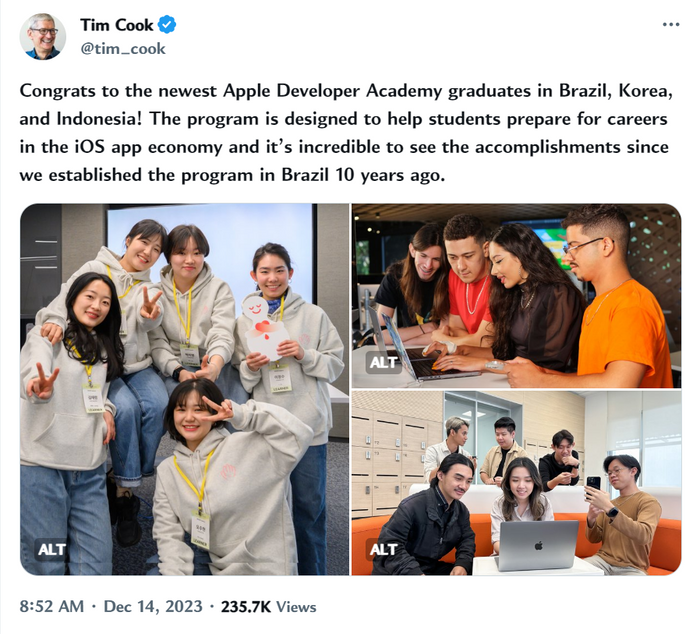 팀 쿡 CEO는 11일 소셜미디어 엑스(X·옛 트위터) 계정에 "한국, 브라질, 인도네시아에서 애플 개발자 아카데미의 새로운 수료생들을 축하한다"고 밝혔다.