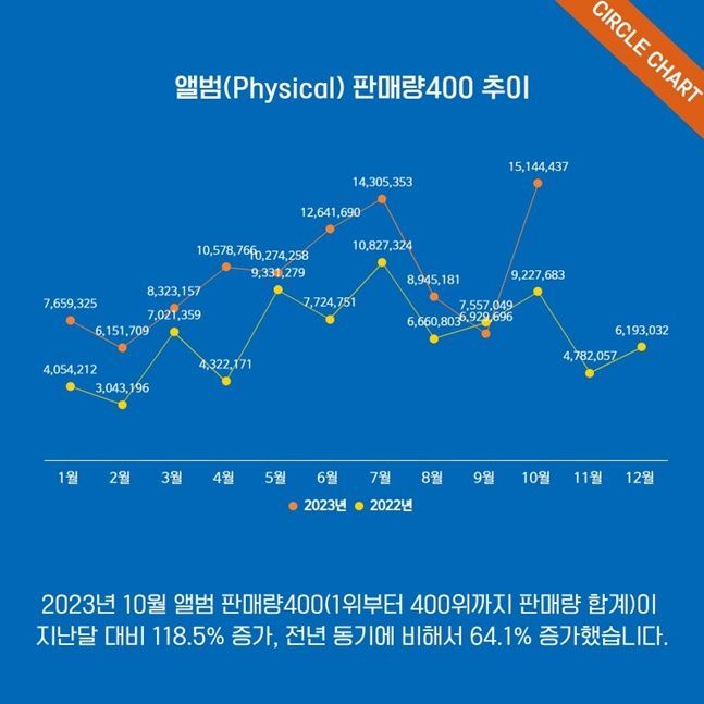 한국음반콘텐츠협회가 운영하는 써클차트 역시 올 1~10월까지 국내 음반 판매량 인기 400위까지의 케이팝 누적 음반 판매량은 총 1억 100만 장으로 집계했다. 이는 지난해 음반 총 판매량인 8000만 장을 훌쩍 넘어선 기록으로, 전년도의 125%에 해당한다. 연말 판매량까지 고려하면 전체 판매량은 기존 전망치를 웃도는 약 1억 1000만 장 이상이 될 것으로 보고 있다.