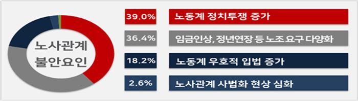 노사관계가 불안할 것으로 전망한 기업들은 ‘노동계 정치투쟁 증가(39.0%)’를 2024년 노사관계의 가장 큰 불안요인으로 전망했다.
