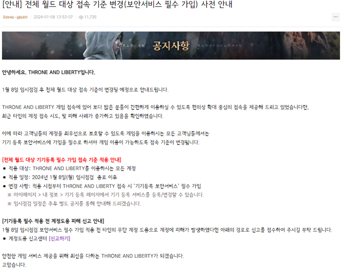 엔씨소프트 'TL' 운영진은 8일 "최근 타인의 계정 접속 시도 및 피해 사례가 증가하고 있음을 확인했다"며 "모든 고객이 기기 등록 보안 서비스에 가입해야만 게임을 이용할 수 있도록 접속 기준을 변경한다"라고 공지했다.