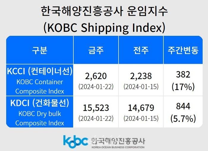 홍해발 해운 위기가 지속하는 가운데 컨테이너 운임이 연일 상승 중이다. 한국해양진흥공사(사장 김양수, 이하 해진공)가 22일 발표한 K-컨테이너운임지수(KCCI)는 2620으로 전주 대비 17.07%(382p) 상승했다. 8주 연속 상승한 것으로, 전주(15.7%)보다 상승 폭도 커졌다.