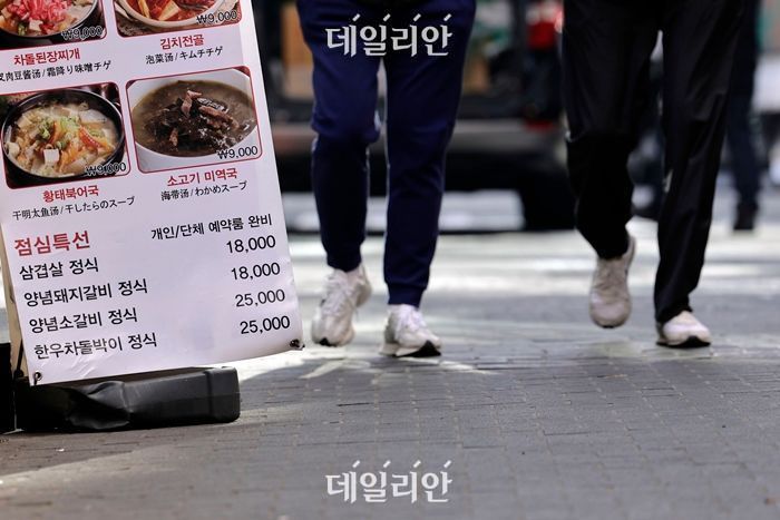 통계청 국가통계포털(KOSIS)에 따르면 지난해 김밥의 소비자물가지수는 125.90(2020=100)으로 전년 대비 8.6% 상승했다. 삼겹살은 지난 2022년 전년 대비 9.0% 오르면서 외식 물가 상승을 끌어당겼다. 사진은 지난 30일 서울 시내 식당의 가격표 모습. ⓒ뉴시스