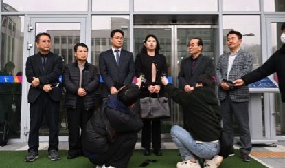15일 오전 광주 동구 광주지법 별관 앞에서 일제강제노역 피해자 지원 변호인단과 유족이 취재진을 향해 강제노역 피해자들이 제기한 소송 1심 결과와 소회를 밝히고 있다.ⓒ뉴시스