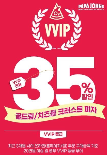 파파존스 피자는 자사앱 회원 가운데 VVIP 회원을 대상으로 자사 홈페이지(PC, 모바일, 앱)에서 라지 사이즈 이상 골드링 또는 치즈롤 크러스트 피자 주문 시 35%의 할인 혜택을 제공한다고 밝혔다.
