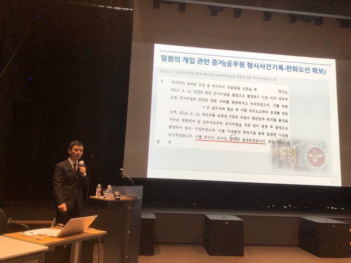 구승모 한화오션 컴플라이언스실 변호사가 5일 서울 중구 장교빌딩에서 언론 대상 설명회에서 HD현대중공업 임원의 군사기밀 불법 탈취 증거를 제시하고 있다. ⓒ데일리안 박영국 기자