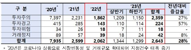 단계별로 투자 주의 2359건, 투자 경고 224건, 투자 위험 18건, 매매 거래정지 42건이 지정됐다.