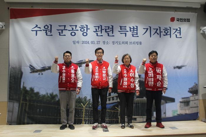 수원 지역 국힘 홍윤오(수원을) 방문규(수원병) 이수정(수원정) 박재순(수원무) 후보는 27일 경기도의회에서 기자회견을 열어 "국민의힘은 말로만 하지 않겠다. 수원군공항 문제 반드시 해결하겠다"고 밝혔다. 김현준(수원갑) 후보는 개인 일정으로 참석치 못했다.