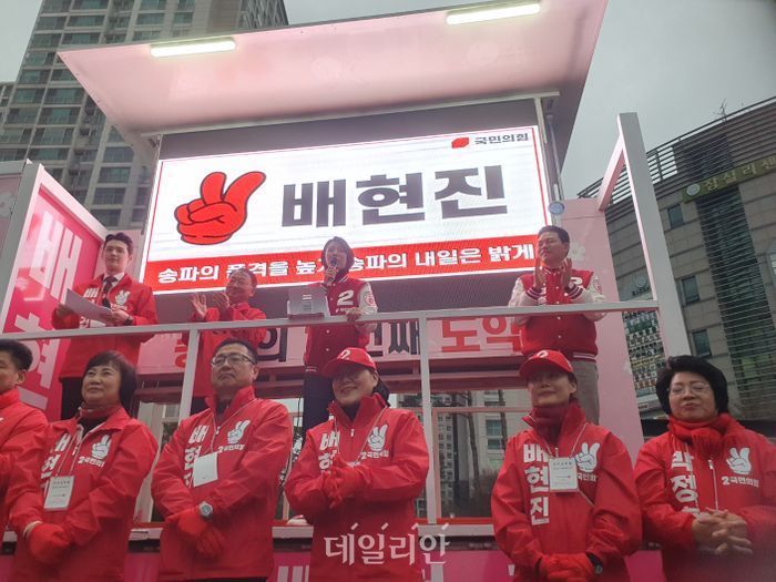 배 후보는 "이 배현진에게 4년을 투자해서 송파에 조그마한 보탬이라도 됐다고 여기신다면 집권여당인 우리 국민의힘에게 힘을 실어달라"며 "윤 대통령에겐 아직 3년의 시간이 있다. 때로 못마땅하시고 언짢으신 것도 잘 안다. 그러나 다른 누구도 아닌 바로 국민 여러분의 삶을 위해서 집권여당인 국민의힘에 꼭 한 번만 힘을 실어달라"고 호소했다.