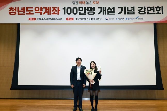 김소영 금융위원회 부위원장(왼쪽)이 1일 오후 서울 중구 IBK중소기업은행 대강당에서 청년도약계좌 100만 번째 개설 기념 강연을 진행한 뒤 기념촬영을 하고 있다. ⓒ 금융위원회