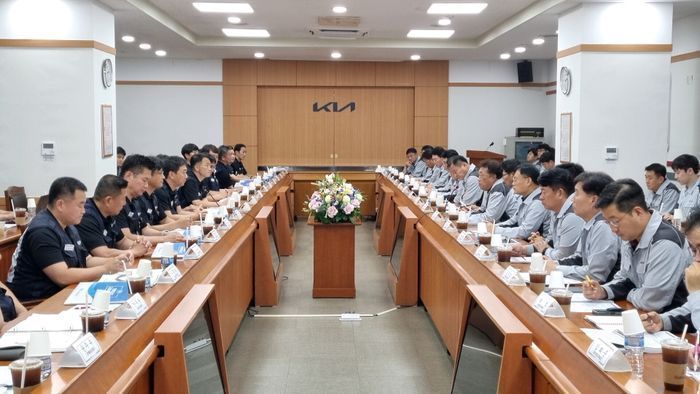 기아 노사가 2023년 7월 6일 경기도 광명시 오토랜드 광명에서 2023 임금협상 상견례를 진행하고 있다. ⓒ기아