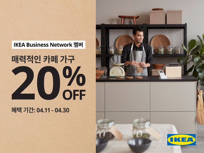 행사 기간 동안 이케아의 비즈니스 고객 대상 무료 멤버십 프로그램 ‘이케아 비즈니스 네트워크(IKEA Business Network)’ 멤버에게는 카페는 물론 레스토랑, 휴게 공간을 단장하기 좋은 가구 제품 115종에 대해 20% 할인 혜택이 제공된다.