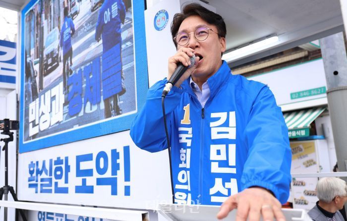 김민석 더불어민주당 영등포을 국회의원 후보가 3일 오후 서울 영등포구 도신로 인근에서 유세 차량에 올라 지지를 호소하고 있다.ⓒ데일리안 방규현 기자