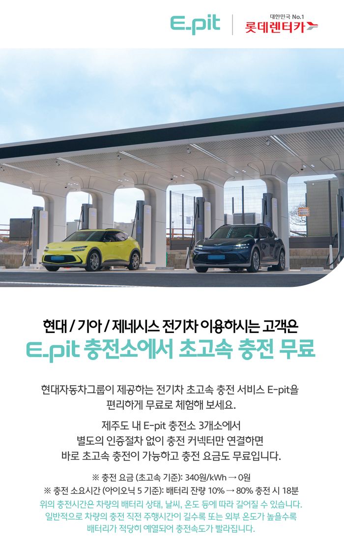 대상 차량을 단기 렌트한 고객이 제주도 E-pit 충전소 내 260킬로와트(㎾)급 충전기에서 초고속 충전을 할 경우 차량 배터리 용량의 80%까지 충전 비용이 전액 지원된다.