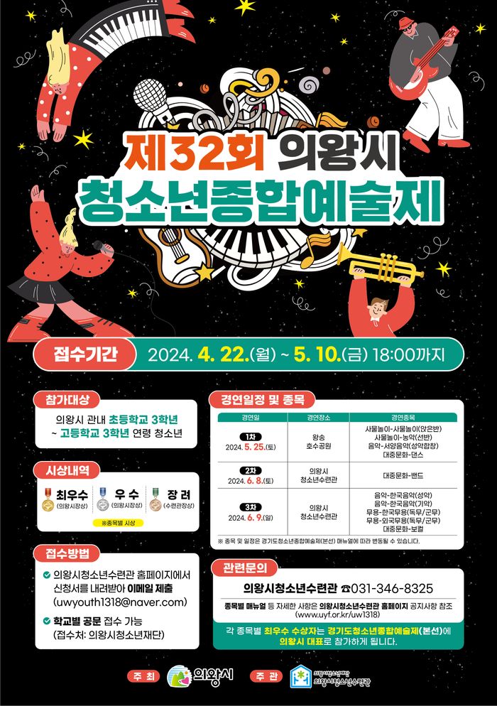 제32회 의왕시청소년종합예술제 참가신청서 및 종목별 매뉴얼 등 자세한 사항은 의왕시청소년수련관 홈페이지 공지사항을 참고하거나, 의왕시청소년수련관 청소년활동팀으로 문의하면 된다.