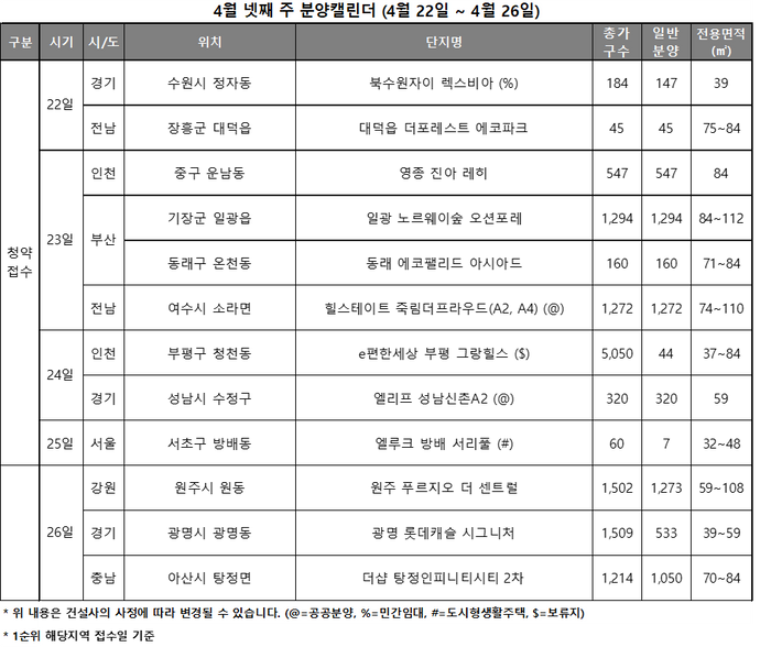 4월 넷째 주에 공급되는 전체 물량의 약 72%가 지방에 집중돼, 청약홈 개편 이후 대부분의 물량이 지방에 집중되던 흐름이 계속될 것으로 보인다. 한편, 청약홈 개편 이후 처음으로 수도권 지역에 1000가구 이상이 공급된다.