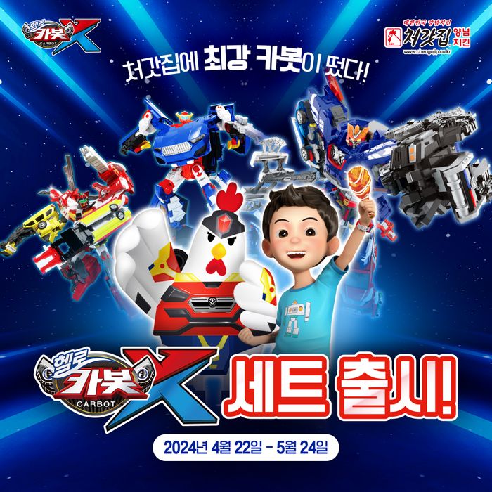 초이락컨텐츠컴퍼니의 인기 IP ‘헬로카봇 X’가 5월 가정의 달을 맞아 치킨 프랜차이즈 브랜드 처갓집양념치킨과 함께 헬로카봇X 스페셜 치킨세트를 출시했다.