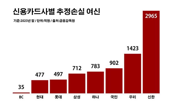 카드사별로 보면 신한카드의 추정손실 여신이 2965억원으로 같은 기간 대비 35.9% 증가하며 최대를 기록했다. 이어 우리카드의 해당 금액이 1423억원으로 176.0% 급증하며 규모가 큰 편이었다. 이밖에 카드사들의 추정손실 여신은 ▲KB국민카드 902억원 ▲하나카드 783억원 ▲삼성카드 712억원 ▲롯데카드 497억원 ▲현대카드 477억원 ▲BC카드 35억원 순이었다.