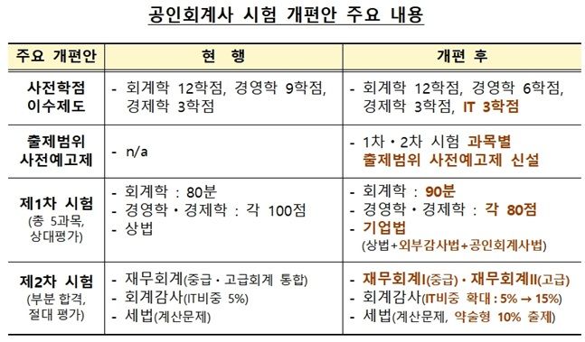 금감원은 실무 연관성을 감안해 중요성이 높은 과목은 확대하고, 중요성이 낮은 과목은 축소하기로 했다. 이에 따라 상법(1차)은 외부감사법, 공인회계사법을 추가해 기업법으로 개편하고, 재무회계(2차)는 중급(재무회계 I)과 고급회계(재무회계 II)로 분리한다.