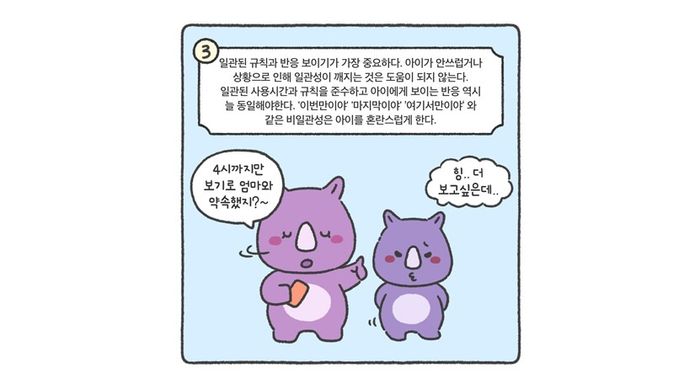 세 번째, 일관된 규칙과 반응 보이기가 가장 중요하다. 아이가 안쓰럽거나 상황으로 인해 일관성이 깨지는 것은 도움이 되지 않는다. 일관된 사용 시간과 규칙을 준수하고 아이에게 보이는 반응 역시 늘 동일해야 한다. '이번만이야' '마지막이야' ’여기서만이야‘ 와 같은 비일관성은 아이를 혼란스럽게 한다.