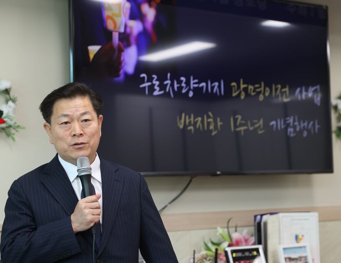 박승원 광명시장이 9일 밤일마을서 열린 구로차량기지 광명이전 백지화 1주년 기념행사에서 인사말을 하고 있다.ⓒ광명시 제공