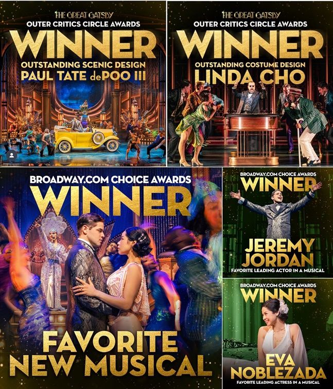 뿐만 아니라 제73회 외부 비평가 협회 상(Outer Critics Circle Awards)에서 무대디자인과 의상디자인 부문을 수상해 2관왕의 영예를 안았으며, 관객들의 투표로 결정되는 2024 브로드웨이 닷컴 관객 초이스 어워즈에서 ‘FAVORITE NEW MUSICAL(뮤지컬 부문)’을 비롯해 ‘FAVORITE LEADING ACTOR/ACTRESS(뮤지컬 부문)’로 뮤지컬 ‘위대한 개츠비’의 두 주인공, 제레미 조던(Jeremy Jordan)과 에바 노블자다(Eva Noblezada)가 선정되어 3관왕을 석권했다.