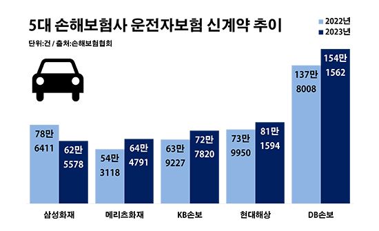 제동이 걸린 건 삼성화재뿐이었다. 삼성화재의 운전자보험 신계약은 62만5578건으로 20.5%나 줄었다. 2022년까지만 해도 DB손보에 이어 두 번째로 운전자보험 신계약을 많이 따냈었지만, 지난해에는 5대 손보사 중 다섯 번째로 밀려난 실정이다.