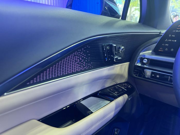 도어트림은 독일 럭셔리 브랜드와 비교해도 손색없을 정도로 고급스럽다.시트 포지션 조작부 옆에 특이한 패턴이 들어갔는데, 숲속 나무 사이로 빛이 스며들어오는 풍경에서 영감을 받아 만들었다는 설명이다. 그래서 도어트림에는 나무 무늬가 적용돼있다.