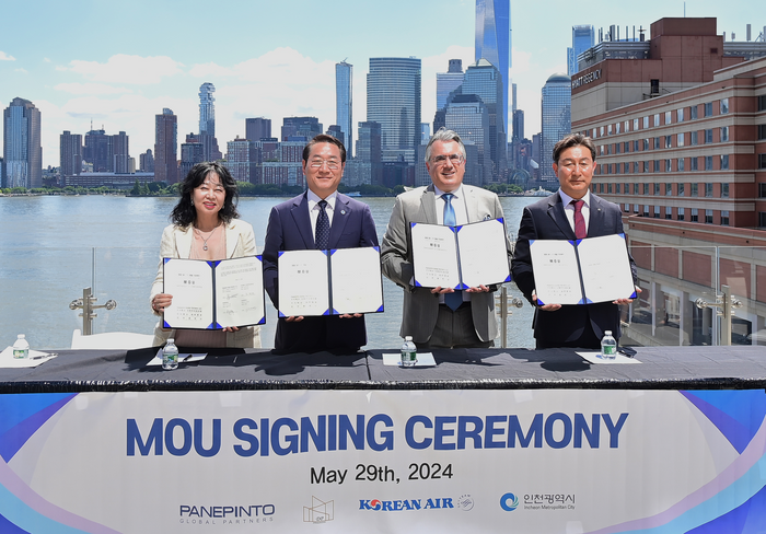 이날 체결식에는 유정복 인천시장을 비롯, 파나핀토 글로벌 파트너스 죠셉 파나핀토 주니어(Joseph Panepinto Jr.) 회장, 대한항공 관계자, 디피인터내셔날 대표가 참석해 양해각서에 서명했다.