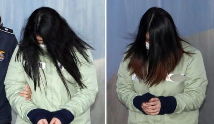 '인천 초등생 살인' 혐의로 구속된 피고인 박모씨와 김모씨가 머리카락을 풀어헤쳐 얼굴을 가린 채 지난 2018년 4월 항소심 선고 공판을 받기 위해 서울중앙지방법원으로 출석하고 있다.ⓒ뉴시스