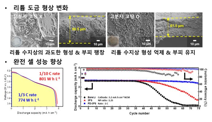 특히 고분자 구조체를 활용한 연구팀의 니켈·코발트·망간(NCM) 양극 기반 리튬금속전지(고집적 NCM 양극, NP ratio(음극/양극 용량비율): 1.0)는 기존 리튬이온전지보다 두 배 이상 큰 최대 801 Wh/L의 방전 기준 에너지 밀도를 보였다.
