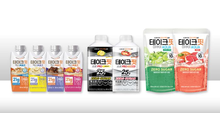 현재 시중에 판매 중인 테이크핏 음료는 ▲250ml ‘테이크핏 맥스’ 4종 ▲아르지닌과 카페인을 첨가해 운동 전에 마시면 효과적인 450ml ‘테이크핏 프로’ 2종, ▲얼음컵에 담아 마실 수 있는 파우치 형태의 230ml ‘테이크핏 아쿠아’ 2종 등 총 8종이 있다.