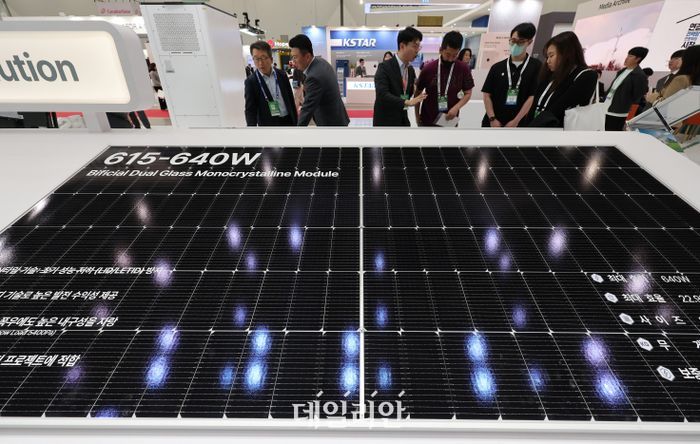 지난 4월 24일 대구 북구 엑스코에서 개막한 ‘2024 국제그린에너지엑스포’를 찾은 관람객들이 태양광 모듈 부스를 살펴보고 있다.ⓒ뉴시스
