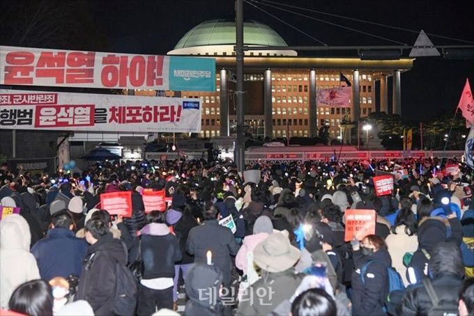 윤석열 대통령 탄핵소추안이 본회의에 상정됐던 지난 7일 서울 여의도 국회 앞에서 시민들이 탄핵 가결을 촉구하고 있다. ⓒ데일리안 홍금표 기자