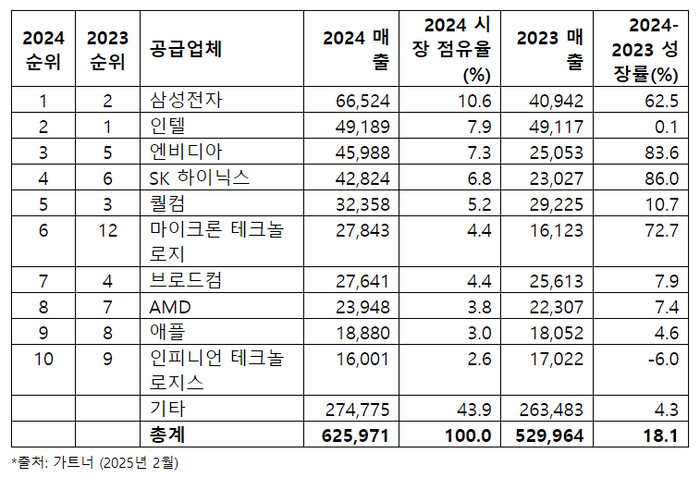 2024년 전 세계 매출 기준 상위 10개 반도체 공급업체 (단위: 백만 달러)ⓒ가트너