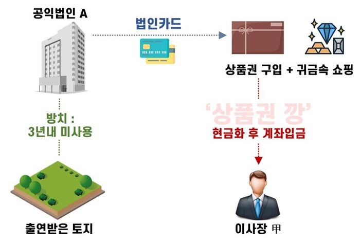A 공익법인은 상품권 수십억원을 법인카드로 구매해 이를 할인 판매하는 방식으로 현금화했다. 이른바 ‘상품권 깡’이다. 이렇게 만든 현금은 이사장 개인 계좌로 입금해 사용했고, 귀금속 등도 법인카드로 사용해 사적으로 유용했다.