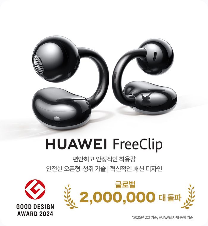 한국화웨이 컨슈머 비즈니스 그룹은 오픈형 무선 이어폰 ‘화웨이 프리클립(FreeClip)’을 오는 24일 한국 시장에 공식 출시한다고 17일 밝혔다. 이에 앞서 이달 17일부터 23일까지 쿠팡을 통해 단독 사전 판매를 진행한다.